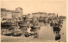 Vissersvaartuigen aangemeerd in het Schuildok langs de Visserskaai. Op de Visserskaai staan de wagons van de vistreinen