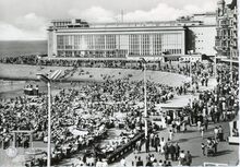 Nels. - De westgevel van het vierde Kursaal langs de Albert I-Promenade. Een amfibieboot op het groot strand.