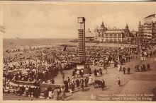 De Albert I-Promenade gezien vanaf de badinstallaties richting de westgevel van het derde Kursaal. We zien de toren van de badinstallaties met uurwerk.