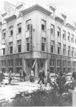 Afbraak van de "Kredietbank", gelegen op de hoek van de Kapellestraat (links) en de Wittenonnenstraat (rechts). Het nieuwe bankgebouw werd ingehuldigd op 5 november 1976
