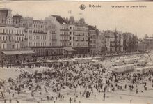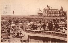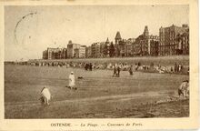 Β Nels. - OstendeΒ -Plage et Kursaal. Oostende - Strand en Kursaal. - StrandrecreatieΒ op het GrootΒ Strand, met links de kinderclubΒ "Papa Ours", nabijΒ de badinstallatiesΒ onderΒ de Albert I-promenade. Op de achtergrond, de westelijkeΒ gevelΒ van het derdeΒ Kursaal