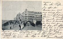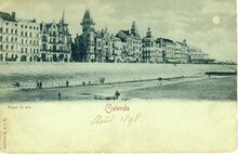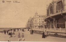 De Zeedijk gezien ten Oosten van de noordgevel van hetΒ derde Kursaal, richting de havengeul. Op de hoek met de Kursaal-Oosthelling, het Hotel Royal Belge.