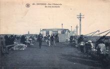 Walschaerts 121. - Β Ostende -Β Sur L'Estacade. On the stockade. - Foto genomen op het einde van het Weststaketsel. In de achtergrond links, de noodvuurtoren op de Oosteroever, opgericht na de Eerste Wereldoorlog. Van 1920 tot 1926 was de noodvuurtoren in gebruik.