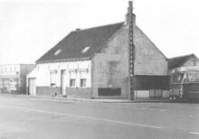 Huizenrij in het gedeelte tussen de Ooststraat (links) en de Wittenonnenstraat (rechts), met het verlaten gebouw van drukkerij en papierhandel Firmin Dewulf, Kerkstraat 11. Links, detail van taverne "Ossepoot"