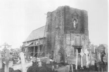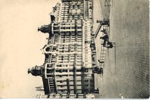 De westelijke gevel van het derde Kursaal gelegen langs de Zeedijk. Links, het Groot Strand bij hoog tij.