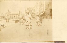 Een vrouw poserend op de Zeedijk. In de achtergrond de westgevel van het derde Kursaal.