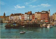Kruger, N° 933/111. - Vissersvaartuigen gemeerd in het Montgomerydok nabij de Vistrap. O.a : de O.486 "Chantal", de O.77 "Jeannine", de O.718 "Yves-Patrick". De Visserskaai en rechts, de Nieuwstraat met zicht op de toren van het Feest- en Cultuurpaleis aan het Wapenplein. Links, de toren, genaamd de "Peperbusse", van de door brand vernielde Sint Pieterskerk