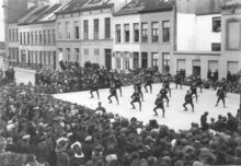 Optreden van de "Turn- en Wapenmaatschappij" op het pleintje aan de Oesterbankstraat. De huizen op de achtergrond zijn gelegen tussen de Slachthuiskaai (links) en de Fregatstraat (rechts)