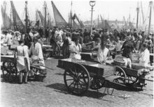 Stemmig beeld van de aktiviteit aan de Visserskaai. Sedert 1960 zijn de pittoreske viskarretjes verdwenen uit het stadsbeeld.