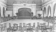 De grote feestzaal mat vierhonderd vierkante meter. Boven het toneelpodium en in de kroonlijst bevonden zich de sculpturen van Godfried Devreeze