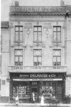 Filiaal van "Adolphe Delhaize & Cie". Gelegen aan de oostelijke kant, naast de danszaal "Valentino" (rechts). Men leverde aan huis met fiets en stootkar. Luifelopschrift : General Ship Supplying. Let op de mooie gevel en straatlantaarn.