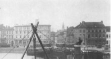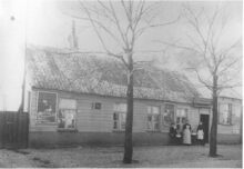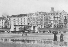 Vissersvrouwen poseren voor de oude vismijn. Omwille van de ronde vorm van het compleks kreeg de vismijn de bijnaam "De Cirk".