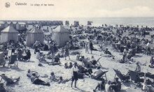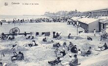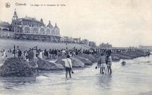Nels. - OstendeΒ -Β Concours de forts Γ la plage. - WedstrijdΒ "forten" of zandkastelenΒ bouwenΒ op het GrootΒ Strand. De vloedΒ heeftΒ de zandkastelenΒ bereikt. Wie het langstΒ zijnΒ vlagΒ op het "fort" bleefΒ staan, had gewonnen. Rechts, op de Albert I-promenade, het "Majestic Palace Hotel"