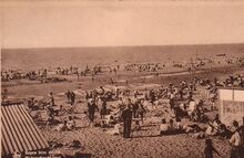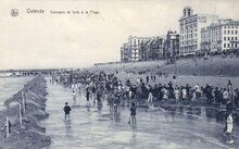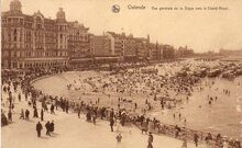 De Zeedijk gezien vanaf de kursaal richting het Royal Palace Hotel. Strandrecreatie op het Groot Strand
