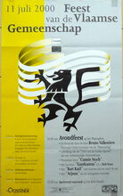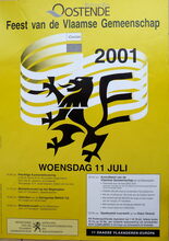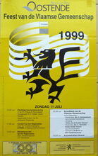 Formaat : 60 x 42 cm. - Plechtige Eucharistieviering in de St. - Petrus en Pauluskerk opgeluisterd door Het St. -Janskoor uit Oostende. Voorganger : E.H. Jozef Dessein, deken van de stad. Beiaardconcert op het Wapenplein door J.P. Hautekiet, stadsbeiaardier. Optreden van de Dansgroep IMAGO Tijl ter hoogte van het Kursaal. Beiaardconcert op het Wapenplein door J.P. Hautekiet, stadsbeiaardier. Avondfeest van de Vlaamse Gemeenschap op het Wapenplein. Feestrede door de heer Eric Suy, Algemeen Voorzitter van de VTB-VAB en voormalig Directeur-Generaal van de Verenigde Naties. Frank Galan zingt en presenteert het programma. Met de uitreiking van "De Orde van de Gulden Sporen". Met Karolien De Meyer die zingt en doet zingen, aan de vleugel J.P. Hautekiet. Met optreden van de dansgroep IMAGO Tijl. Met volksmuziek door Zakdoek. Spetterend vuurwerk op het Klein Strand. Het Rodenbachfonds organiseert van 7 tot 19 juli, een constante tentoonstelling van kunstschilder Mon Camelbeke in het Feest- en Cultuurpaleis te Oostende. - Ontwerp : Willy Bosschem