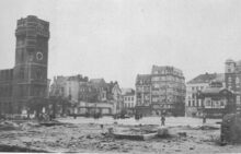 Links de toren van het verwoeste stadhuis waarvan de gevel reeds werd afgebroken. Op de achtergrond een gedeelte van de Kapellestraat