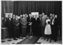 Formaat : 13 x 18 cm. - We herkennen o.a. van rechts naar links : Albert Hagers, Jules Albert Yde, mevrouw R. Henno, Charles Heilman, J. De Vijlder, Pierre-Nicolas Boel, mevrouw Heilman, René Lust, Maurice Vantournhout. Derde van links naar rechts, Léopold Baeys. - Map 006 A-109i