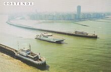 JC. - De Albert I-promenade en links, het Groot Strand bij vloed. Een pakketboot van de Oostende Dover lijn nadert de havengeul