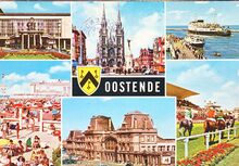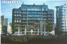 Postkaart JC. - Op de voorgrond, het oorlogsmonument voor de gesneuvelde Oostendse burgers en militairen. Rechts, Hotel Maritime en hostellerie Old Shakespeare. Op de achtergrond, de Sint Petrus en Pauluskerk