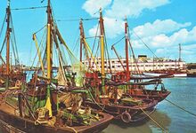 Kruger. - Vissersvaartuigen gemeerd in het Montgomerydok. Het gebouw van het Loodswezen gelegen aan de Sir Winston ChurchillkaaiΒ 2