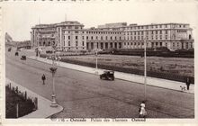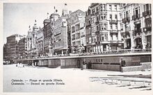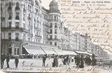 Albert, N° 198. - Ostende - Palais des Thermes. - Gebouwd in neoclassicistische stijl met interieur in art-decostijl naar ontwerp van het Parijse architectencollectief J. Flegelheimer, H. Bard en F. Garella en de Oostendse architect A. Daniels. Aannemer Van Coillie realiseert het project in achtien maanden. Het omvat een Grand Hôtel, zwembad, thermen en thermaal instituut en wordt gedeeltelijk op en tegen de Koninklijke Gaanderijen gebouwd op de terreinen van de vroegere tennis. Op 28 juni 1933 kunnen Koning Albert I en Koningin Elisabeth het complex inhuldigen. Gelegen langs de Generaal Jungbluthlaan, in september 1938, de Koningin Astridlaan. De Generaal Jungbluthlaan bestond maar een achttal jaren. Voor mei 1930 was het de Krommestraat en de Koersenlaan. Op de achtergrond de ingang van Grand Palace Hotel.