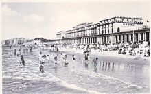 Nels. - Pootjebaden langs de vloedlijn van het Groot Strand nabij de Koninklijke Gaanderijen. In het midden het Palais des Thermes