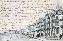 L.L. Brux, N° 40 (?). [Lagaert]. - Ostende - La Digue. - De Zeedijk, gezien vanaf de Parijsstraat, richting de westgevel van het derde Kursaal. Links, het Groot Strand.
