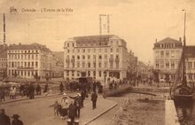 Star, N° 2387. - Ostende - L'Entrée de la ville. - Veel volk. De Kapellebrug en rechtdoor, de Kapellestraat. Rechts, het eerste handelsdok en links, het tweede handelsdok. Langs de Vindictivelaan, "Café Brasserie du Lion", "Hotel de la Couronne" en "Hotel du Bassin"