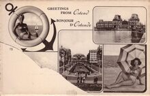 Postkaart U.P.B. - Het Groot Strand. De badinstallaties onder de Albert I-promenade. Rechts, de grote hotels. Oostende in het interbellum.