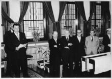 Formaat : 13 x 18 cm. - Plechtigheid op de stadhuis, (Gerechtshof, Canadaplein), naar aanleiding van het 50-jarig bestaan van de Koninklijke Kunstkring Oostende. De secretaris van de kring, Léopold Baeys houdt een toespraak. Naast hem de stichtende leden van de kring : de kunstschilders Jan De Clerck, Jef De Brock, Pierre-Nicolas Boel en Louis Royon. - Map 006 A-109b