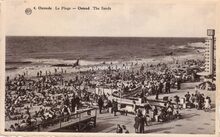VED [Imp. V. Ernult-Doncq, 20, rue des Chartreux, Bruxelles]. - Ostende - Le Kursaal et la Plage. - Strandrecreatie op het Groot Strand en op de achtergrond, gedeelte van de westgevel van het tweede Kursaal
