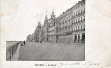 VED. - Ostende - La digue. - De Zeedijk, vanaf de kursaal richting de havengeul. Het vakantieseizoen is voorbij of moet nog beginnen. Het "Grand Hôtel d'Ostende" is nog dicht.