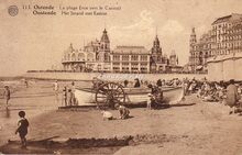 Albert, N° 113. - Ostende - La plage (vue vers le Casino). Het Strand met Kasino (sic). - Het Groot Strand nabij de westelijke gevel van het derde Kursaal gelegen langs de Zeedijk. In het midden, de jol van de strandreddingsdienst en rechts, detail van enkele luxe badkarren