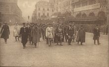 N°3. Les ministres d'Etat de droite à gauche M.M. Renkin, Cooreman, Goblet d'Alviela, Vandervelde (coiffé d'un chapeau mou), Hymans, suivent avec respect la dépouille glorieuse du Soldat Inconnu. - Van rechts naar links, ministers en ministers van Staat : Jules Renkin, Gérard Cooreman, Eugène Goblet d'Alviella, Emile Vandervelde en Paul Hymans. - Map 029A/63c