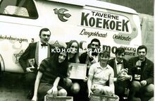 Formaat : 12,5 x 19 cm. - Langestraat 38-40. Personeel van "Taverne Koekoek" (uitbater Ronny Blomme) en dancing-brasserie "Cosmos" voor één van hun publiciteitswagens