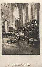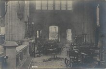 Tijdens de beschietingen van 22 september werd de kerk zwaar beschadigd. Hier het vernield en zwaar beschadigd kerkmeubilair. Er vielen ook drie doden