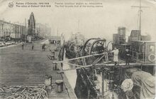 Met opdracht Londen te bombarderen werd de L.12 boven Dover getroffen door een granaat van de Britse luchtdoelartillerie in de nacht van 9 op 10 augustus 1915. Zwaar beschadigd werd de Zeppelin op sleeptouw genomen naar de haven van Oostende. Hier aan de Diepwaterkaai. Rechts de Graaf de Smet de Naeyerbruggen, nog met beelden. Verdere literatuur : Oostende 14-18 / Ferdinand Gevaert, Freddy Hubrechtsen. 1995. p.181-187. Plate bib B228.