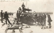 In de nacht van 11 op 12 april 1918 werd door de Britten een eerste blokkade poging ondernomen. Die werd afgelast, daar het rookgordijn het liet afweten door een veranderde windrichting. Een Britse CMB (Coastal Motor Boat) werd geraakt door het vuur van batterij Eylau. Hier het gestrande vaartuig ter hoogte van de Halve Maan. Op de achtergrond het Ooststaketsel. - Verdere literatuur : Oostende in de Groote Oorlog / Erwin Mahieu. 2011. p.113-118. Plate bib A426. Oostende 14-18 / Ferdinand Gevaert, Freddy Hubrechtsen. 1996. p.135-145. Plate bib B229