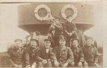 Schipper Pierre Pincket, vooraan derde van rechts, aan boord van de O.131 John van de rederij "Pêcheries à Vapeur". Zittend op de winch, rechts, Pierre Declerck.