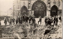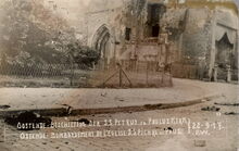 Oostende - Beschieting Der S.S. Petrus en PaulusKerk. Ostende - Bombardement De L'Eglise S.S.S Pierre et Paul 22-9-17. - Tijdens de beschietingen van 22 september 1917 werd de kerk zwaar geraakt. Ook in de omgeving vielen er bommen. Hier in de Prins Boudewijnstraat, het uiteengereten lichaam van juffrouw Marie Verfaillie, dienstmeid van de familie Elleboudt, die net de kerk had verlaten. We zien ook een detail van de "Peperbusse", de kerktoren van de door brand vernielde Sint Pieterskerk.