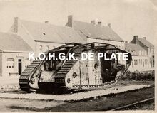 Circa 1922 kreeg deze Britse tank een centrale plaats in Poelkapelle. Er bestaan daar zichtkaarten van. De tank staat er nu niet meer. Wel en schaalmodel.