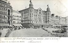 Formaat : 9 x 14 cm. - Albert. N°4. Phototypie A. Dohmen, Bruxelles. - Ostende - La Digue et la Plage. Ostend - The Sea-front and the Shore. - De hotels vanaf de hoek met de Ijzerstraat : Hôtel Continental, Hôtel de l'Océan, Hôtel de la Plage, Hôtel Beau Rivage, Splendid Hôtel.
