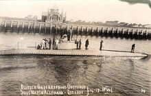 Duitsch onderzeeboot = Sous Marin Allemand. Oostende 14-18. PW 34. - Een Duitse duikboot, UB.1-klasse, vaart de haven van Oostende binnen. Op de oosteroever, het quarantainegebouw en op het einde de Vuurtorenwijk.
