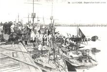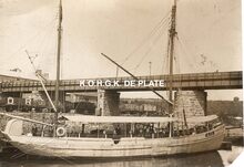 Formaat : 10,5 x 15 cm. - Na aankomst op 23 november 1914 in Milford Haven werd de dandy kotter omgebouwd tot vastliggend schip voor de leerlingen van de Ibis. We zien hen hier in gezelschap van kwartiermeester Constant Vandamme.