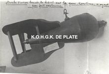 Formaat : 8,5 x 12,5 cm. - Bombe d'avion lancée le 4-5-16 sur la gare Maritime, n'ayant pas fait explosion. - Niet ontplofte vliegtuigbom na een aanval op het Zeestation.