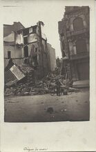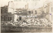 Formaat : 9 x 14 cm. - Marine BΓΌcherei, Photographische Abteilung, Ostende. - De begrafenis vond plaats op 28 september 1917 onder grote belangstelling. Alphonsus Elleboudt, zijn echtgenote Ludovica Desmet en hun zoon Josephus vonden de dood bij een beschieting vanuit zee van hun huis in de Kerkstraat op 25 september 1917. Foto genomen vanop de puinen van het huis van kleermaker Declercq in de Christinastraat, vernield tijdens de beschieting van 25 september 1917. In dit huis kwamen de negen inwoners ongedeerd van onder het puin daar zij zich allen schuil gehouden hadden in de sterk overwelfde kelder.