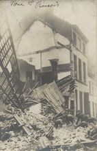 Formaat : 12,5 x 8 cm. - Obus tombé le 21-3-18 rue Eglise 38. Un mort. - Er viel in woning nr.38 één oorlogsslachtoffer : Clement Léontine Marie, echtgenote van Vercoullie Bernard.
