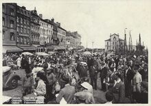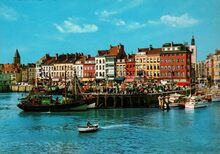 KrΓΌgerΒ [Hamburg], NΒ°933/111. - Oostende - Vissershaven en kaai. Ostende - Port des PΓͺcheurs et quai. Ostend - Fishers harbour and quay. Ostende - Fischereihafen und Kai. - Vooraan het Montgomerydok met aangemeerd aan de vistrap o.a. de O.486 "Chantal". Op de achtergrond de Visserskaai met uiterst links de "Peperbusse", de toren van de door brand vernielde Sint Pieterskerk. Uiterst rechts de Nieuwstraat met de toren van het Feest- en Kultuurpaleis op het Wapenplein.