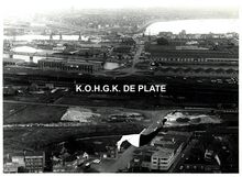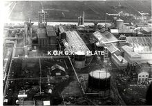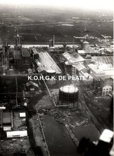 Formaat : 13 x 17,5 cm. - Luchtfoto. - Rechts, de creosoteerwerf gelegen langs het kanaal Oostende-Brugge.