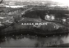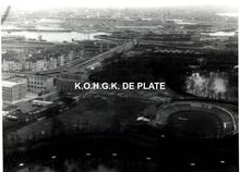 Formaat : 13 x 17,5 cm. - Luchtfoto. - Vooraan het Maria-Hendrikapark met de Velodroom. Links de Bootsman Jonsen kazerne van de Zeemacht. Wat verder de Graaf de Smet de Naeyerlaan en aansluitend de Graaf de Smet de Naeyerbruggen met op de achtergrond de haven.